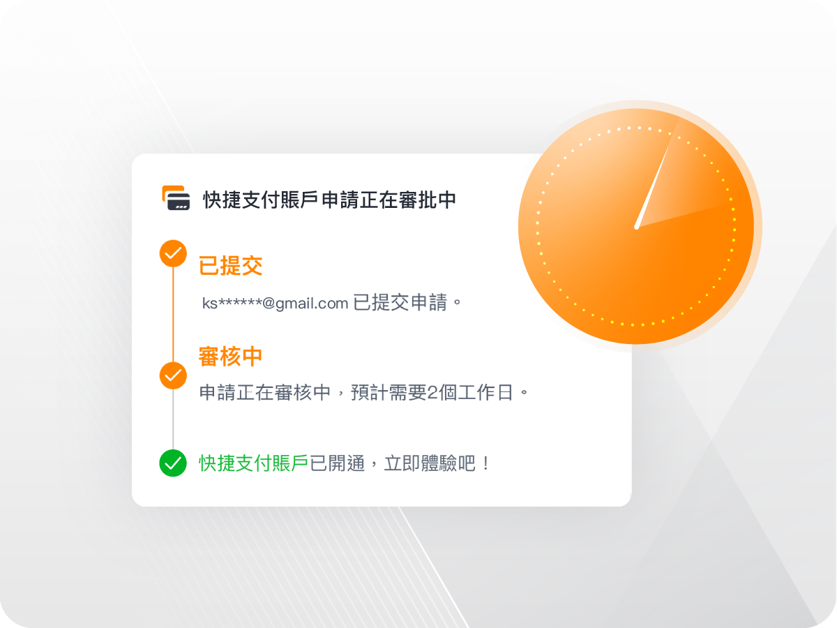 數10秒,撳3下!申請快捷支付賬戶*,就係咁簡單。無需額外遞交文件,72小時快速批核。拒絕麻煩流程及文件,助你極速起步。